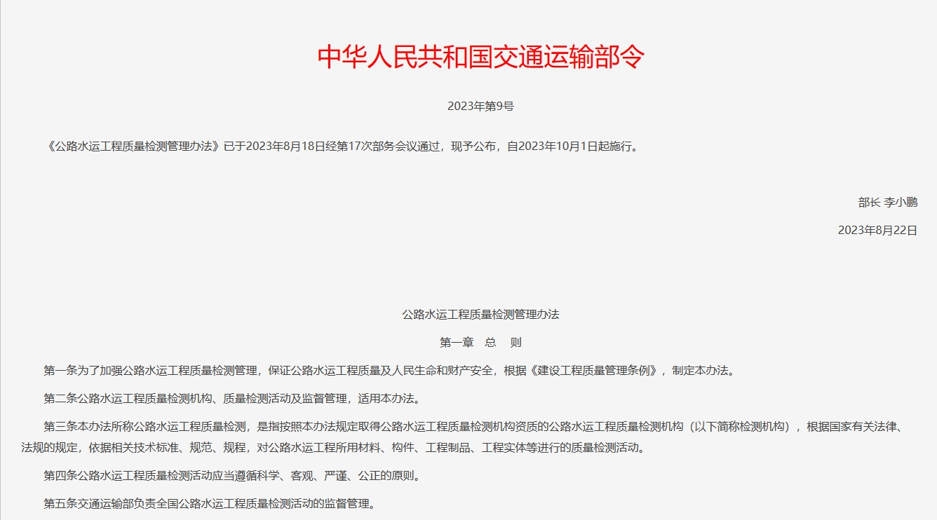 公路水運工程質量檢測管理辦法(中華人民共和國交通運輸部令2023年第9號)